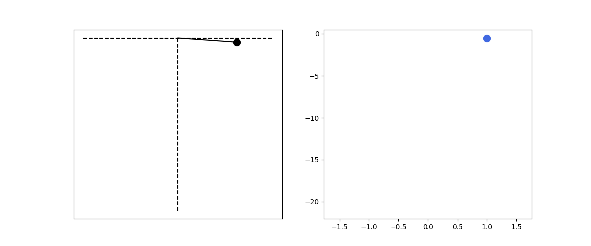 Let’s consider simulations in 2D. First, let’s assume a mass fixed to ceiling by a spring and free to move in two dimensions under the influence of the spring force and gravity. Let the mass poition be represented by the vector $\textbf{r}$, the fixation point is the origin, gravity acceleration is $\textbf{g} = -g \hat{\textbf{j}}$, where $g = 9.8$, the unstretched spring length is $l$ and $\hat{\textbf{r}}$ is the unit vector in the direction along the spring. Then: