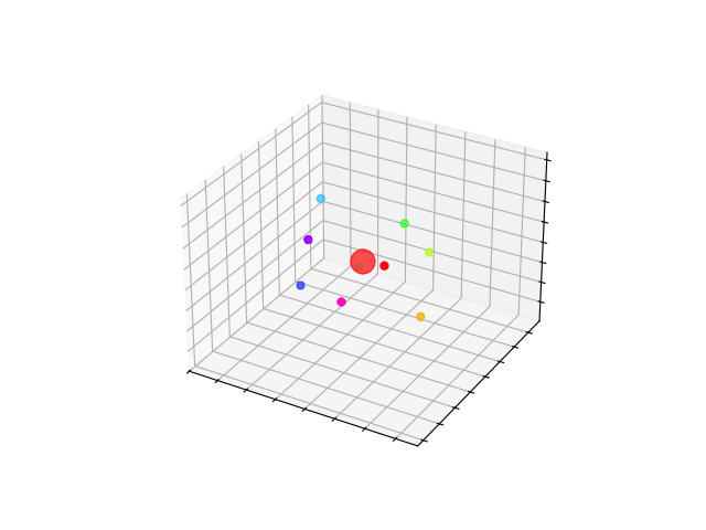 \[\frac{d^2 r}{dt^2} = -G \sum_{i=1}^N \frac{m_i}{|r_i|^3} r_i\]G = 1e-3